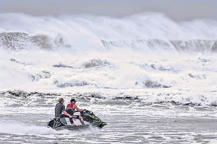 A jet ski with a surfer moves across record-breaking waves at Kirra Beach as outer fringe of Cyclone Alfred started whipping Coolangatta, Australia, on Thursday