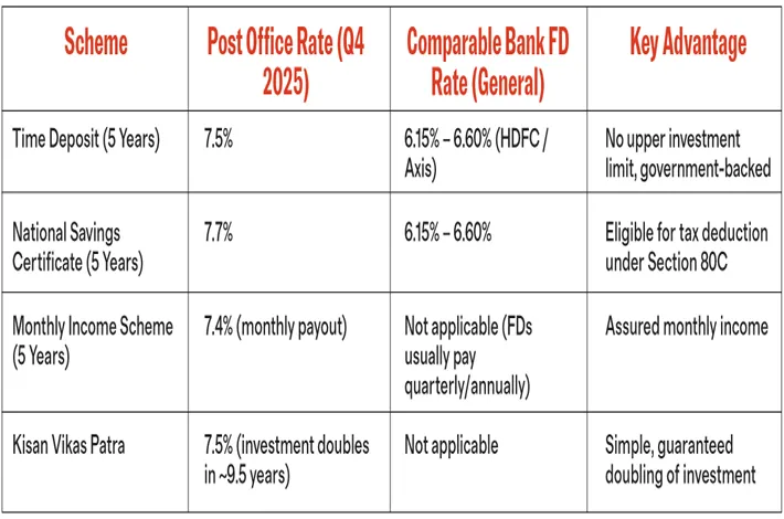 The debate intensifies when the focus shifts to regular income options. The Monthly Income Scheme is presented as a steady cash-flow tool, offering around 7.4 percent interest paid monthly. While bank FDs typically pay interest quarterly or annually, the MIS is pitched as a reliable alternative for households that depend on consistent monthly income, despite having defined investment limits.