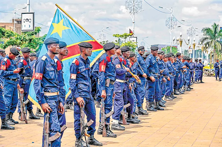 Democratic Republic of Congo police officers stand on guard during a parade in Kinshasa, on Monday
