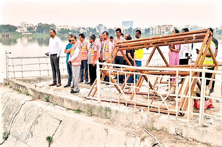 The Commissioner accompanied by LB Nagar Zonal Commissioner Hemanth Keshav Patil and Asst Commissioner (Sanitation) Raghu Prasad, visited and inspected the Lake premises in the wake of Ganesh idol immersion activities. He reviewed the current condition of the lake and its surroundings with officials from line departments, emphasizing the need to maintain cleanliness, water quality and safeguarding the lake’s ecosystem through sustained efforts.