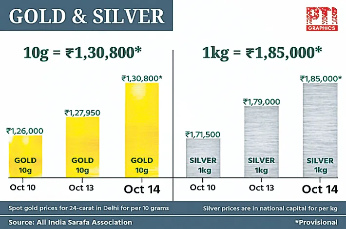 Gold of 99.5 per cent purity also advanced by Rs 2,850 to hit a record Rs 1,30,200 per 10 grams (inclusive of all taxes), from the previous close of Rs 1,27,350 per 10 grams.