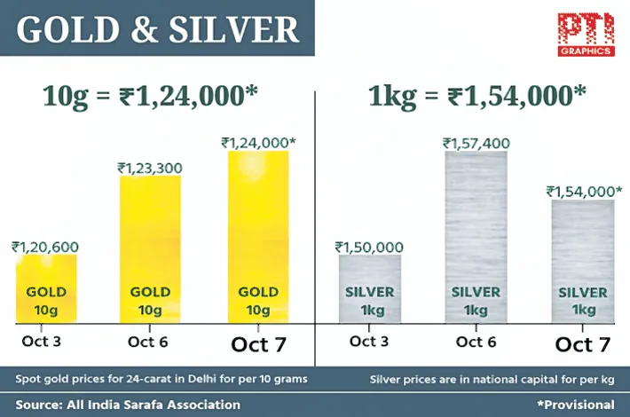 Gold price jumped Rs 700 to hit a record high of Rs 1,24,000 per 10 grams in the national capital on Tuesday as investors weighed the risk of an ongoing US government shutdown and growing bets of additional rate cuts by the Federal Reserve.