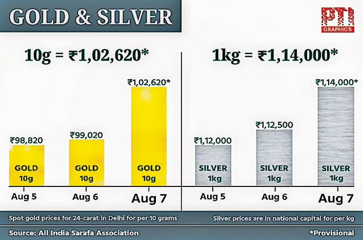 "Additionally, the US administration imposed an additional 25 per cent tariff on Indian imports, intensifying the trade tensions between the two economies," Saumil Gandhi, Senior Analyst, Commodities at HDFC Securities, said. Also, silver prices jumped Rs 1,500 to Rs 1,14,000 per kilogram (inclusive of all taxes) on Thursday. The white metal had ended at Rs 1,12,500 per kg on Wednesday, according to the association.