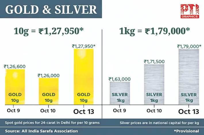 In addition, gold of 99.5 per cent purity jumped by Rs 1,950 to touch an all-time high of Rs 1,27,350 per 10 grams (inclusive of all taxes). The yellow metal had settled at Rs 1,25,400 per 10 grams in the previous market session.