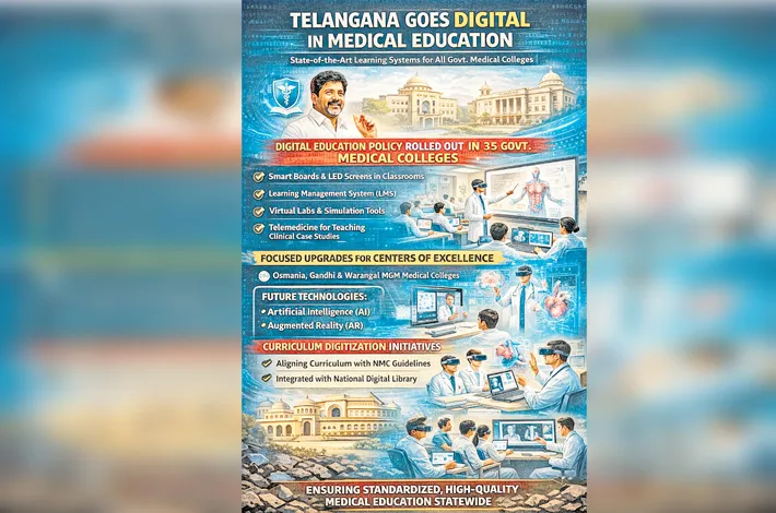 In a major initiative to upgrade the standards of medical education in the state, the Department of Health, Medical and Family Welfare has decided to implement a comprehensive Digital Education policy in Government Medical Colleges. Health Minister Damodar Raja Narasimha has directed officials to immediately roll out state-of-the-art digital education systems across all 35 government medical colleges, moving beyond traditional teaching methods.