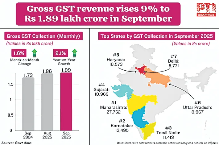 Net GST revenue stood at Rs 1.60 lakh crore in September 2025, recording 5 per cent year-on-year growth.