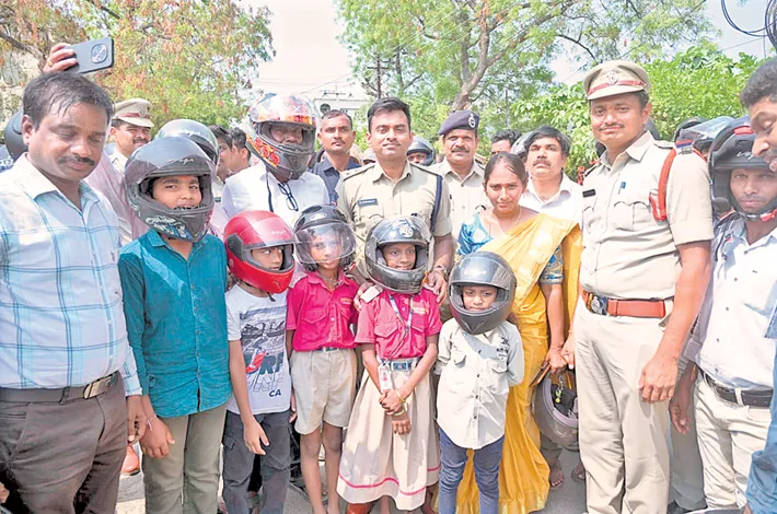 District SP Dr. Shabari and his daughter, along with DSPs, transport officials, education staff and police personnel, participated in the rally with their children wearing helmets. The initiative aimed to promote road safety awareness among the public.