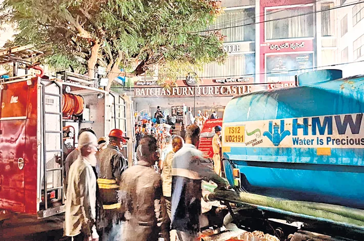 A fire broke out at a furniture shop in Nampally on Saturday. The Telangana Integrated Command Control received the information and immediately alerted HMWSSB headquarters to arrange water tankers for firefighting.