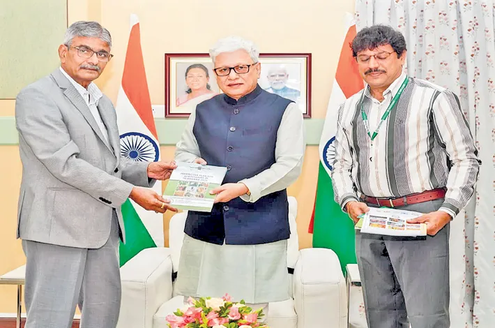 The Telangana State Horticulture perspective Plan-2035 prepared by Sri Konda Laxman Telangana Horticultural University was presented to Governor Vishnu Dev Varma by Vice Chancellor of Horticultural University Dr. Danda Rajireddy. On Saturday, at the Governor's office, Vice Chancellor of Horticultural University Dr. Danda Rajireddy met the Governor and presented him with the album of the recently organized fourth university convocation. At the same time, the recently prepared State Horticulture perspective Plan-2035 prepared by the University was also presented to the Governor and explained.