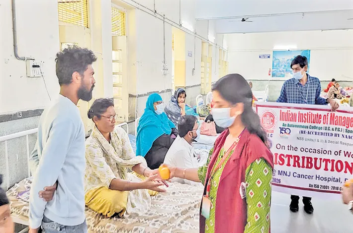 Hyderabad: On the occasion of World Cancer Day, NSS volunteers of IIMC College in Lakdikapool, under the guidance of the Social Responsibility Committee” of the college distributed fruits to 300 cancer patients undergoing treatment at MNJ Cancer Hospital in Red Hills. Addressing the gathering, college principal Raghuveer urged everyone to stay vigilant against cancer. He emphasized creating awareness about tobacco, tobacco products, food items containing harmful chemicals, and carcinogenic substances.