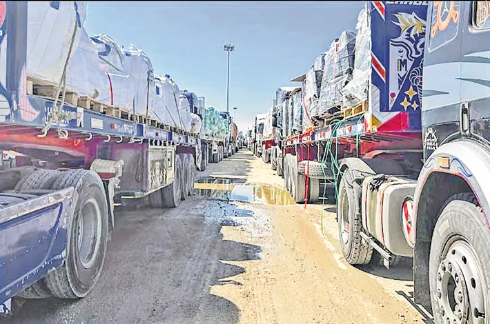Trucks line up at the Rafah border crossing between Egypt and Gaza as Israel stops entry of aid on Sunday —AP