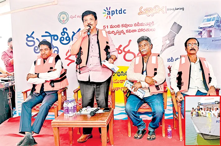 As part of the unique initiative, 51 poets from Andhra Pradesh, Telangana and Mumbai recited their poems aboard the ‘Bodhisiri’ boat while cruising on the Krishna River. Minister Durgesh, accompanied by NTR District Collector Dr. G. Lakshmisha, personally travelled on the vessel and listened to the poetic renditions with keen interest.