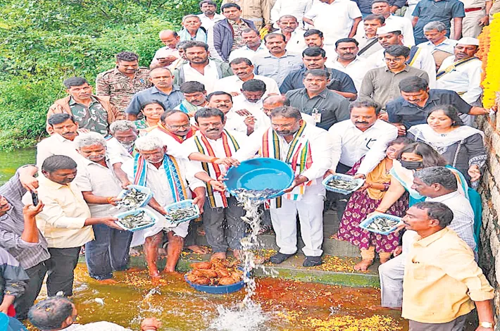 Speaking on the occasion, MLA GMR said that the previous government had completely neglected the Fisheries Department, while the Congress people’s government under Minister Vakiti Srihari has revitalized it with renewed focus on fishermen’s welfare. He mentioned that 2.5 lakh fish seedlings of 82 mm size were released during the programme and said the government is committed to ensuring the economic upliftment of fishermen families.