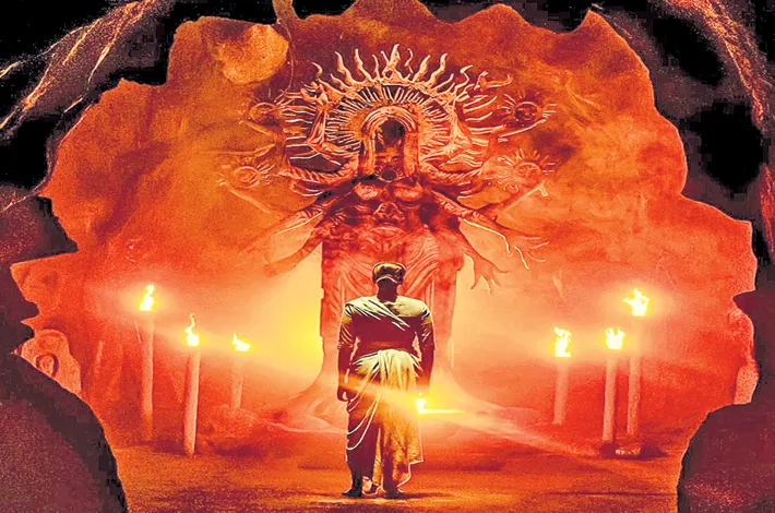 The poster showcases a dark cave illuminated by faint torchlight, a mystical twelve-handed idol, and a girl standing before it, hinting at an intense and intriguing narrative.