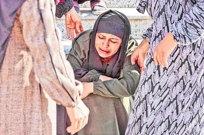 A woman is comforted as she bids farewell to the victims killed by Israeli bombardment in Beit Lahia —AFP