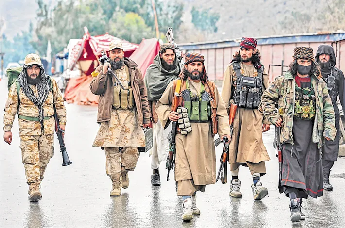 Taliban fighters patrol near the closed Torkham border with Pakistan, where Pakistani and Afghan forces exchanged fire on overnight on Tuesday —AP/PTI