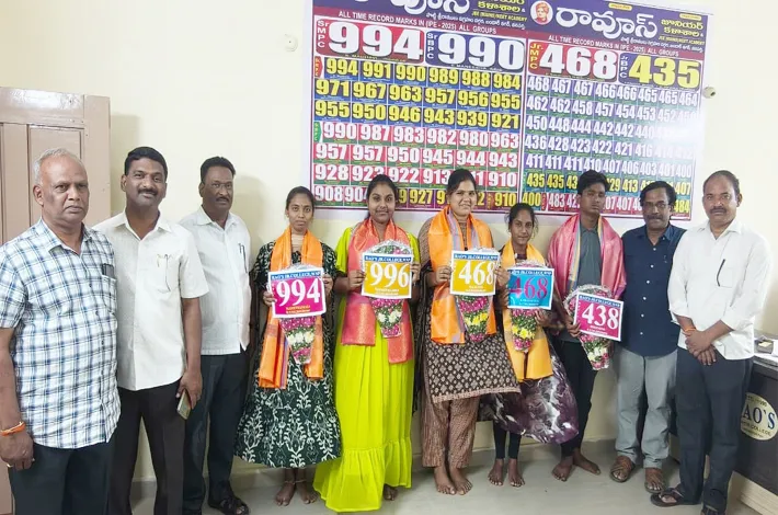 Students of Rao's Junior College, Wanaparthy, delivered outstanding performance in the Intermediate Public Examination results announced on Sunday, creating a record at the state level. In the second year MPC stream, M. Hasitha Sri secured 996/1000 marks and stood State First, while M. Akshaya and Rimsha Begum scored 994 marks each, and B. Santosh Naidu secured 993 marks.