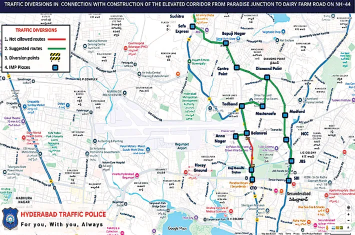 In connection with the commencement of construction of the elevated corridor from Paradise Junction to Dairy Farm Road on NH-44, the following road closures, traffic diversions, alternative routes, will be implemented from 30-10-2025 for a period of approximately nine months.