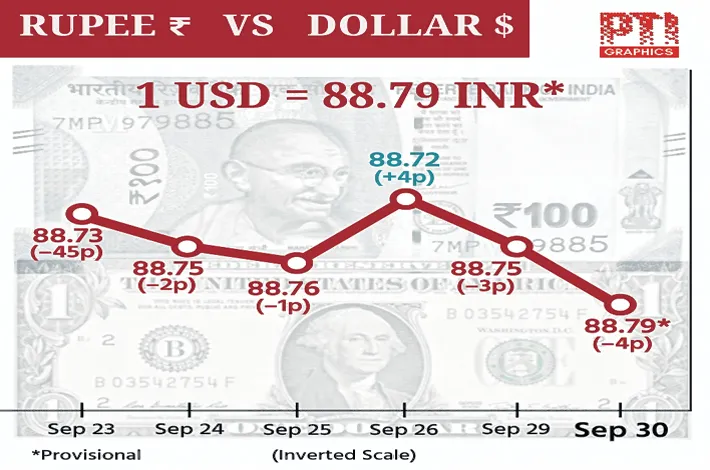 At the interbank foreign exchange, the rupee opened at 88.73 against the dollar and traded in the range of 88.69-88.85 before settling at 88.80, lower by 5 paise against its previous close.