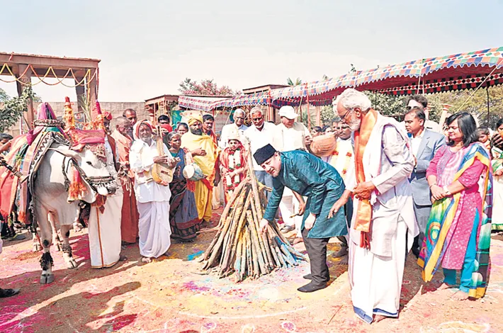 The sprawling estate was transformed into a vibrant festival setting, featuring traditional rangoli designs, a Bhogi campfire, worship of the Sun God, folk dances, Haridasu devotional songs, Gangireddhulu performances, kite flying, and Vedic peace hymns. Guests also enjoyed a grand feast of Sankranthi delicacies, including sweet pongal and other traditional dishes.