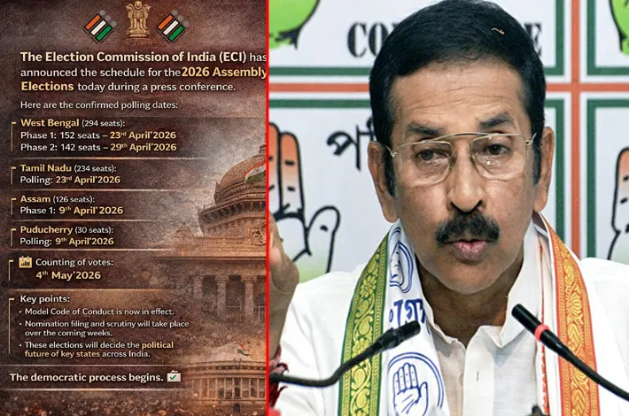 The Election Commission on Sunday announced the schedule of assembly elections for four states and one UT under which polling will be held on a single day in Assam, Kerala and Puducherry on April 9, in two-phases in West Bengal on April 23 and 29, and in Tamil Nadu on April 23. Addressing a press conference here, Chief Election Commissioner Gyanesh Kumar said the counting of votes for all 824 seats across four states and one Union Territory will be held on May 4.
