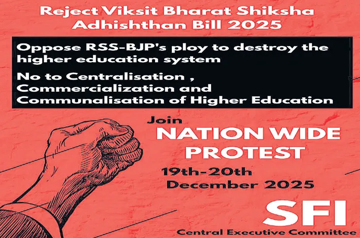 The Student Federation of India (SFI) is organising a nationwide protest against the Viksit Bharat Shiksha Adhishthan Bill, 2025, alleging that the legislation threatens public education, undermines democratic space for students and teachers, and pushes India’s higher education system towards excessive centralisation.