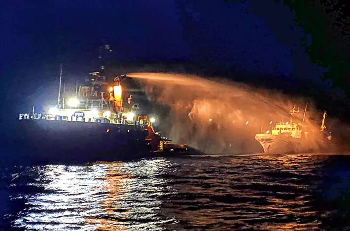 A Malta Vessel Traffic Services (VTS) vessel attempts to douse the fire on vessel Conscience (R)