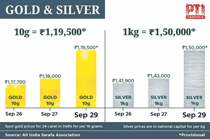 Silver prices on Monday soared by Rs 7,000 to hit an all-time high of Rs 1.5 lakh per kilogram in the national capital, while gold also scaled a fresh peak of Rs 1,19,500 per 10 grams amid strong global trends as investors turned to the safe-haven asset amid concerns over a possible US government shutdown.