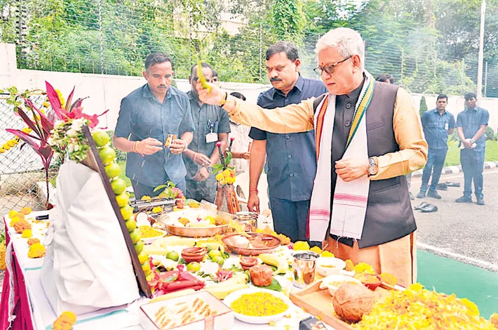 As part of the Dasara festival celebrations, Governor Jishnu Dev Varma performed Ayudha Puja and Vahana Puja at Raj Bhavan on Tuesday. The traditional rituals involved offering prayers to the weapons of the security personnel and to all vehicles within the Raj Bhavan premises.