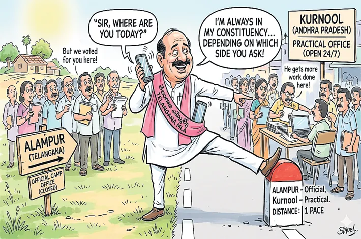 It may sound bizarre but true. If people wish to meet Alampur MLA Vijayudu, he would have to crisscross to the neighboring state Andhra Pradesh. The MLA is reportedly conducting his official activities from the Challa Compound in Kurnool city instead of using the camp office located in Alampur.