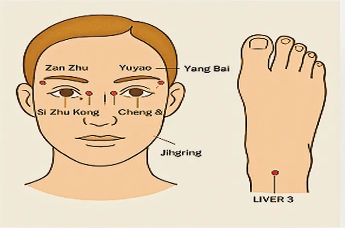 Cheng Qi point: Located directly under the center of the eye, massage gently in circular motions for 10–15 seconds, repeat 6–10 times.
