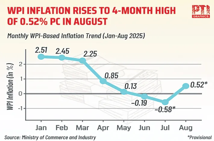 Wholesale price inflation rose to a four-month high of 0.52 per cent in August as prices of food articles and manufactured items inched up, even though fuel and power basket witnessed easing.